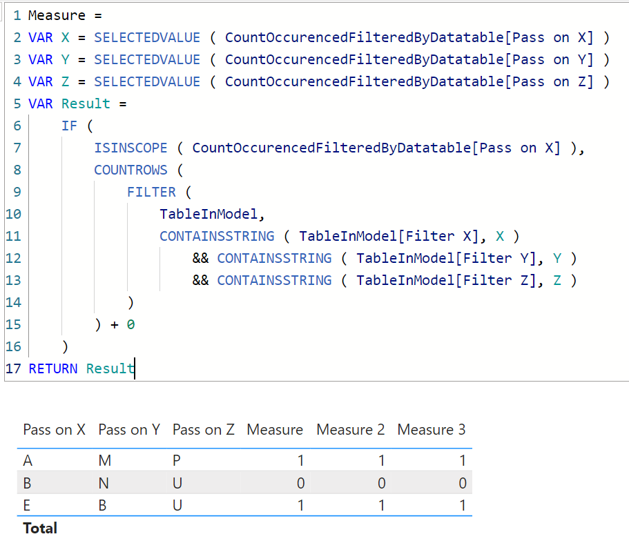 countrows(treatas(summarizecolumns(Filter X,Filter Y, Filter Z),Pass on X,Pass on Y,Pass on Z))