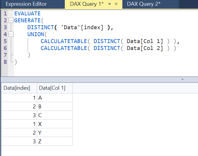 CALCULATETABLE( DISTINCT( Data[Col 2] ))