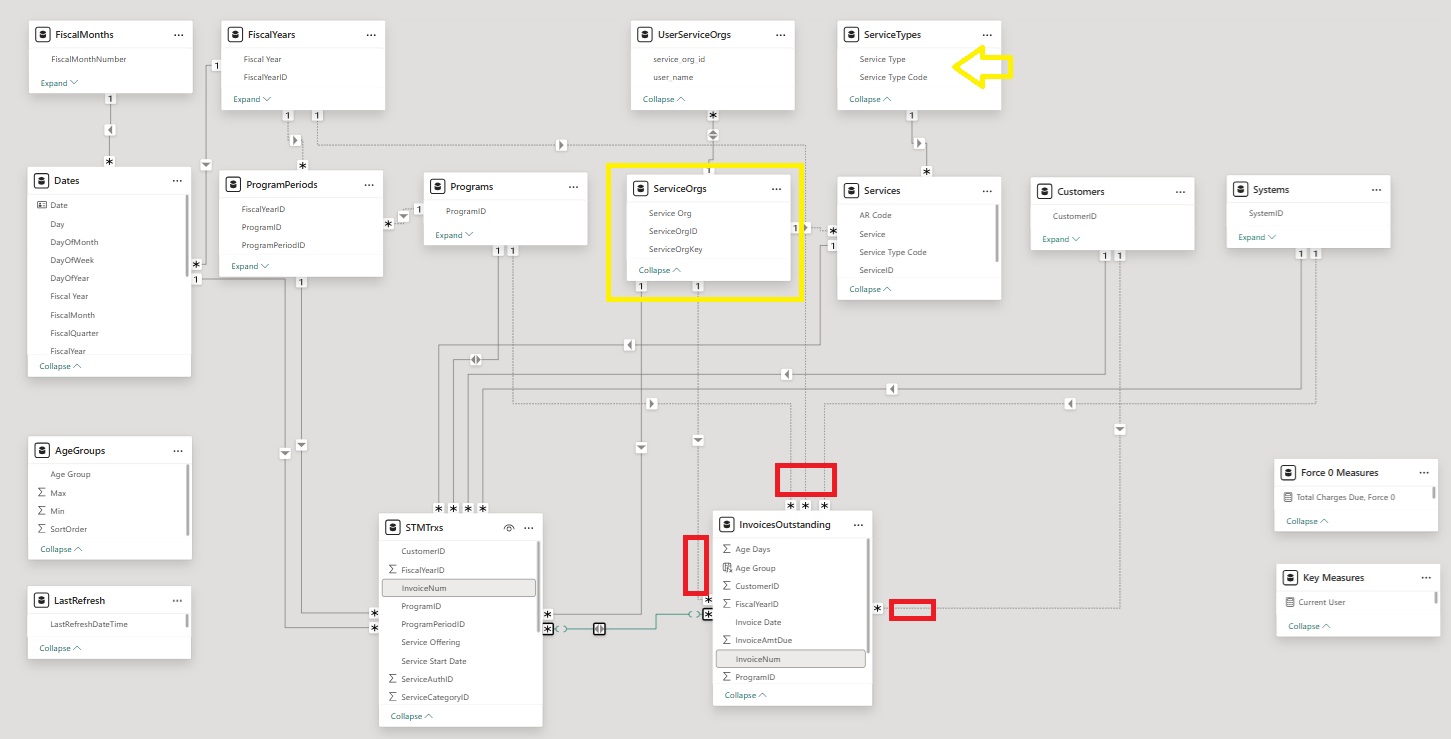 It’s not easy to tell, but you can’t get from ServiceTypes to Services to fact table 2 (InvoicesOutstanding), so the actual filter path went from ServiceTypes to Services to fact table 1 (STMTrxs) then up to Programs via bi-directional relationship and then back down to fact table 2 (InvoicesOutstanding). And yeah, I had to stare at it for a while :P.