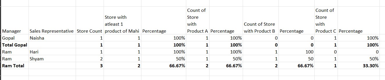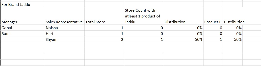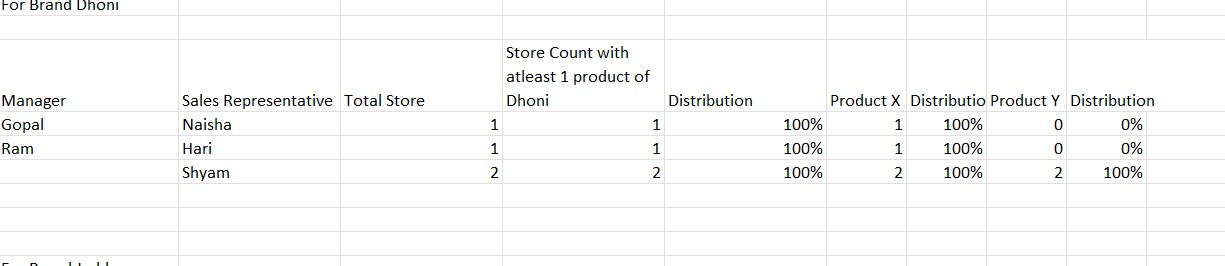 I have a table which consist of column, store number, store name, manager, sales rep, brand and product. I want to count the number of store for each sales rep that has atleast 1 prodcut of the brand for and distribution.