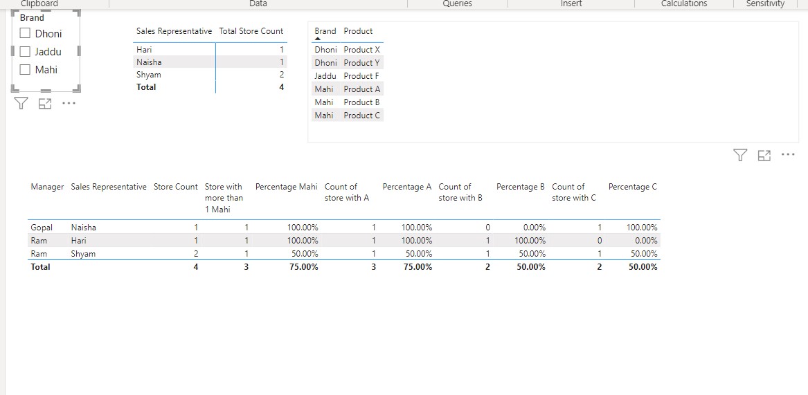 Similary, when the user select Jaddu brand in the slicer, the output table should look like this