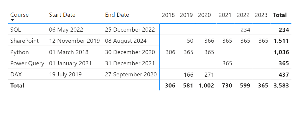 I have this data in one table and have also created a calendar table. The date column in the calendar table is linked to the end date. It currently lumps the days in the end hire date year. I know why it does this but trying to work what I need to do to separate the no days in to 2015, 2016 and 2017.
