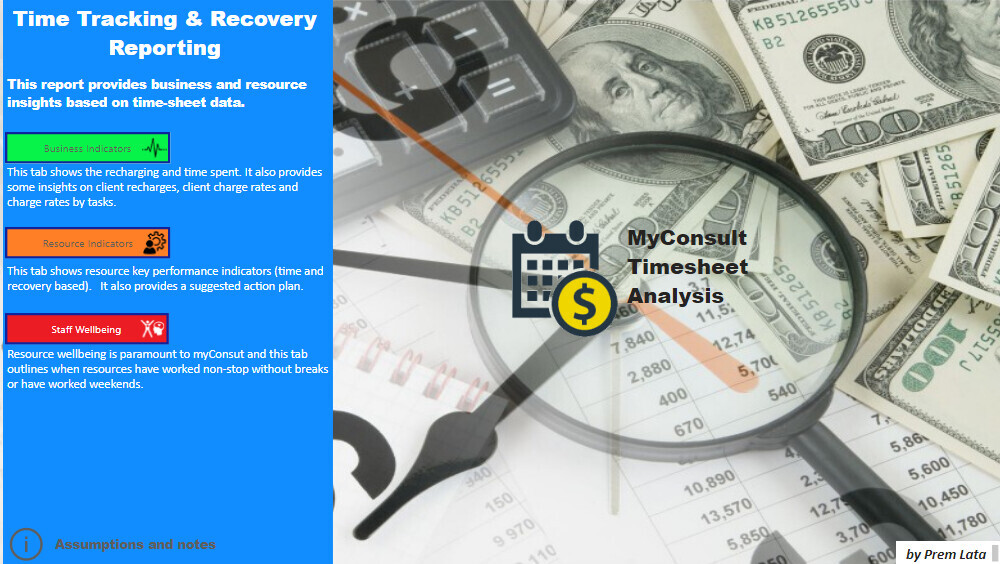 I have kept it very simple and have extracted some indicators that a consultancy manager is likely to be looking for - both for business improvement and resource management. I have assumed a single resource so have not used filters etc - as for the years, I have made the visuals (most - there are a couple of static ones) responsive.
