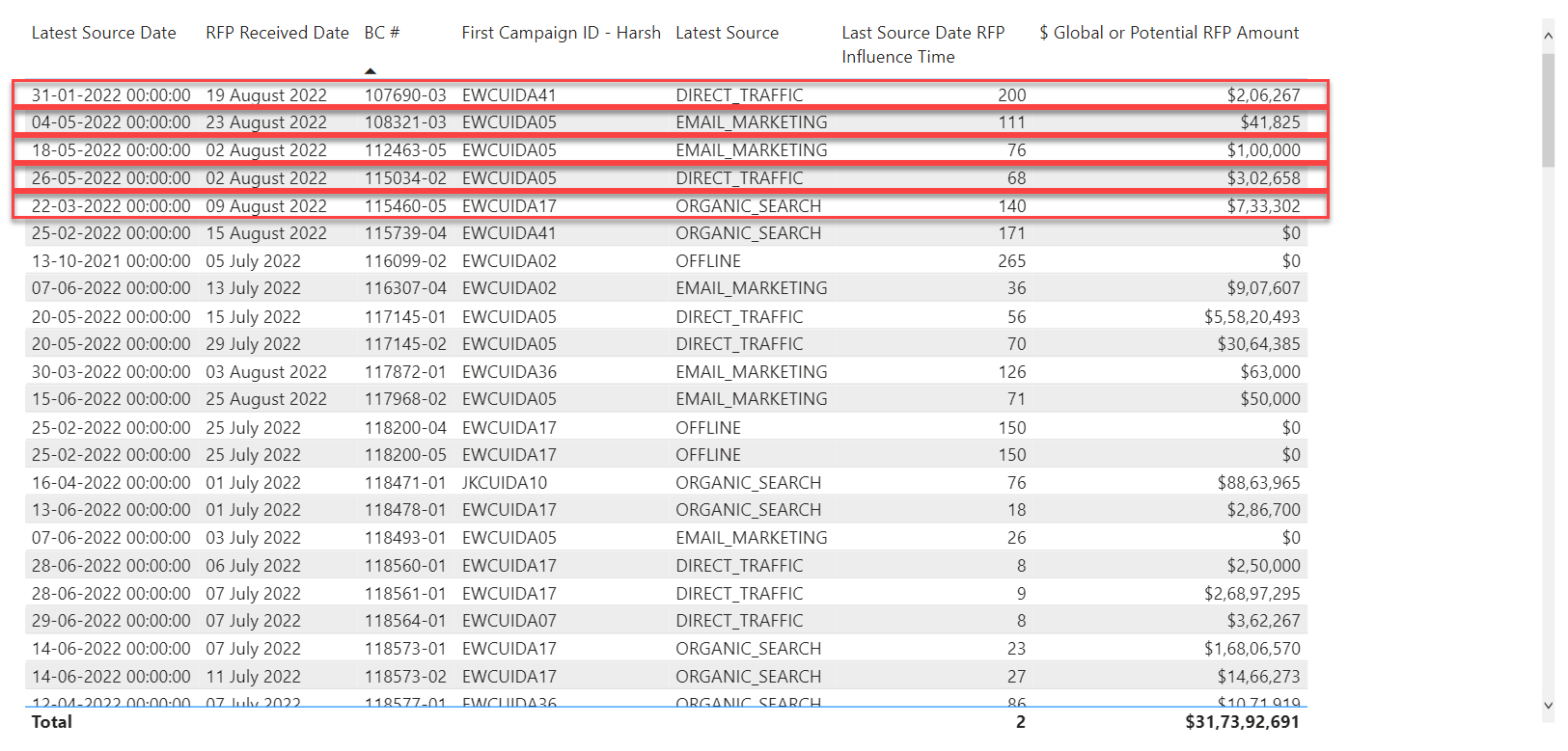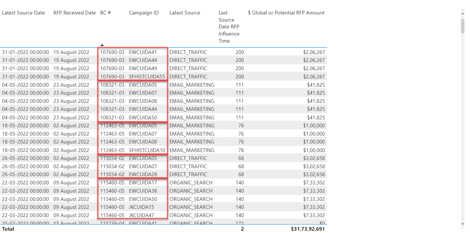 The reason why you’re getting the same results for the remaining set of rows is because for each group of “BC #” there’s a unique “Campaign ID” on their respective “Latest Source Date” and therefore due to that it’s showcasing this type of results. Below is the screenshot provided -