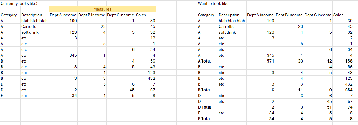 I tried this with a Matrix, but they don’t want the items measure to be repeated per department too, just shown once at the end in the column totals.
