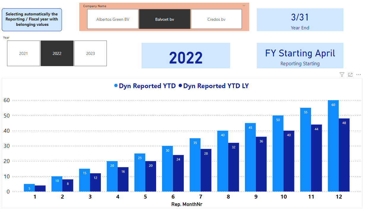 - The fiscal year slicer consists of the fiscal years included in the Dim table ‘Client periods’ and is therefore limited to the fiscal years applicable for the selected company. To my knowledge, including the ‘Year’ of a date table would imply that all years included in the date table are included in the slicer as well and therefore return years for which no data is available.